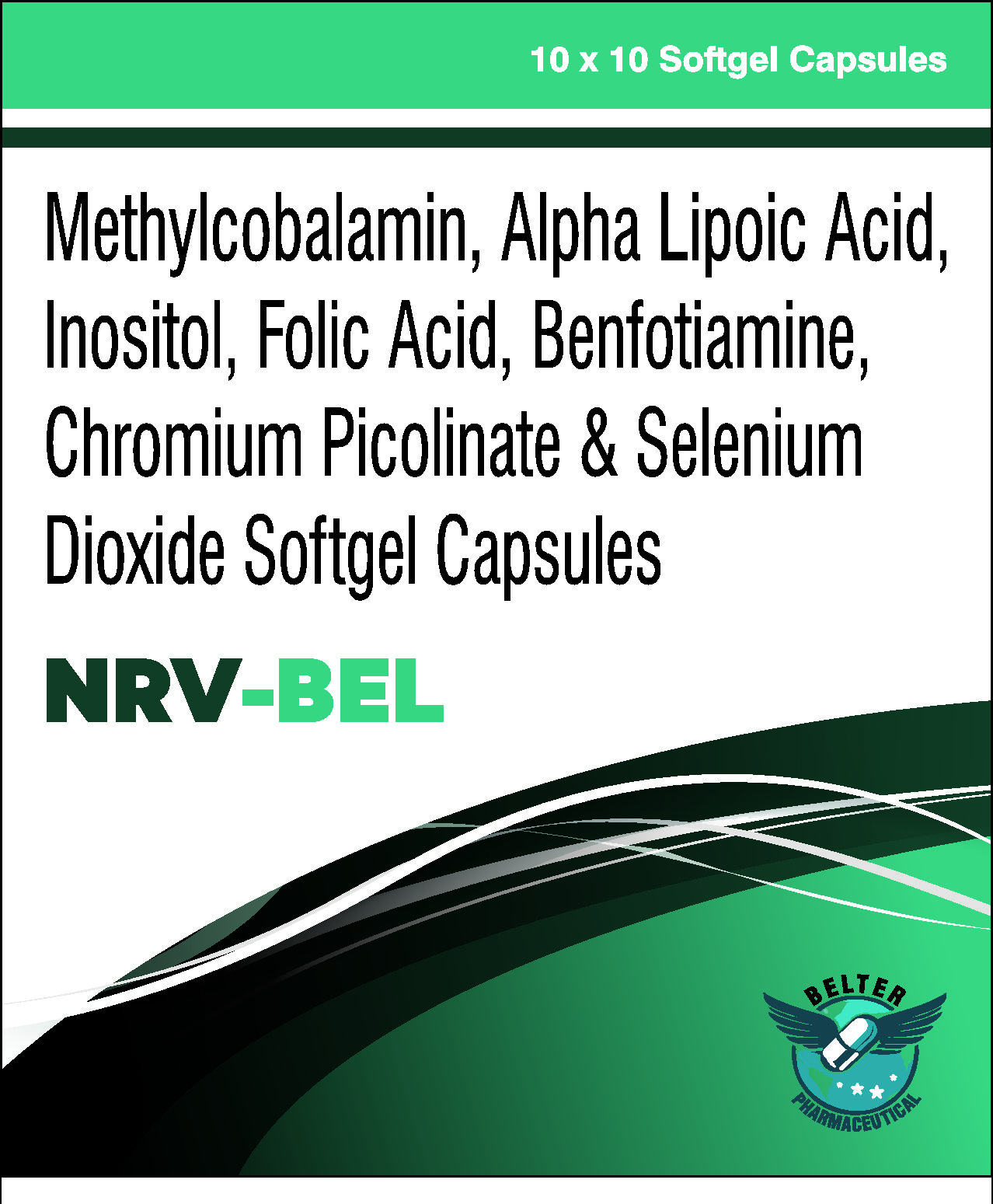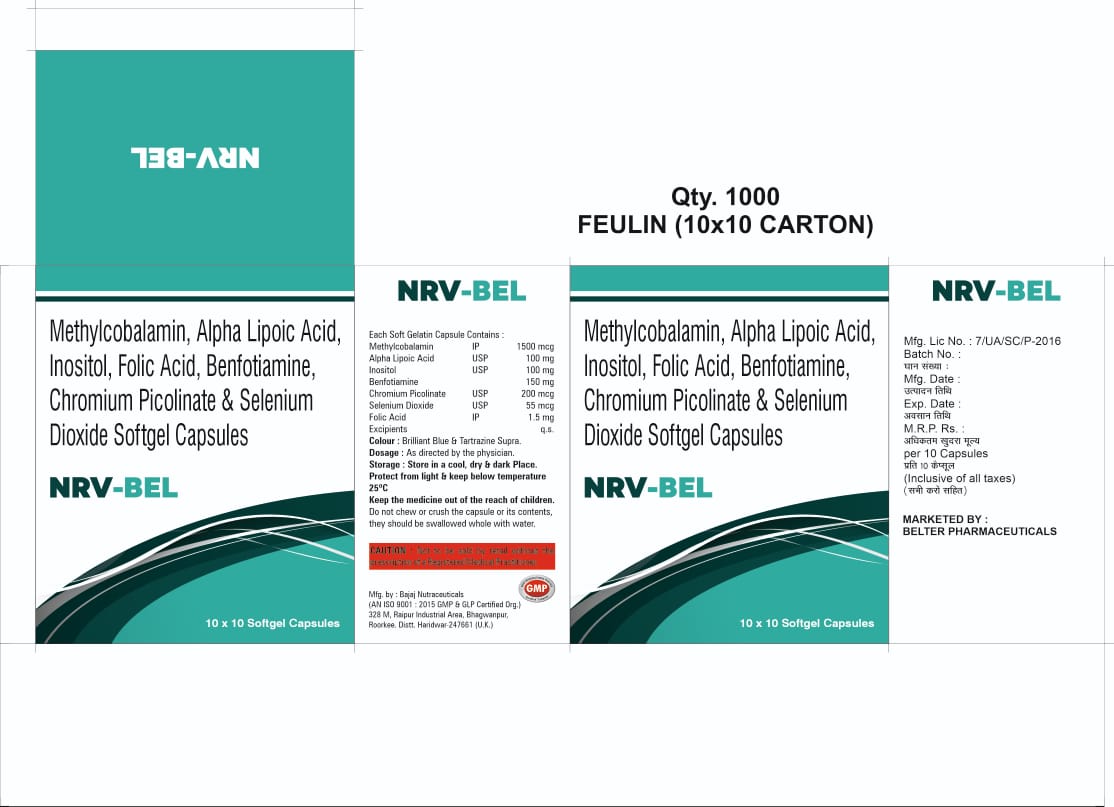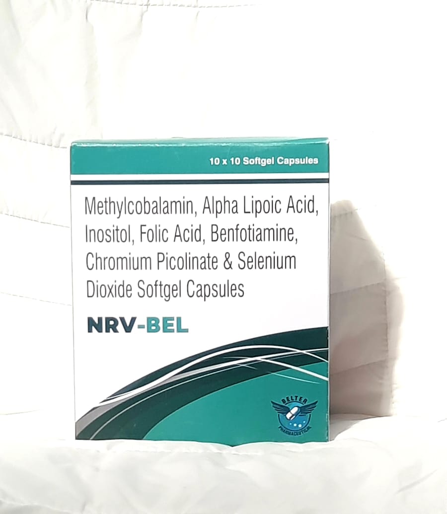 NRVBEL Composition – Methylcobalamin 1500 mg, Benfotimine 150 mg ,Alpha Lipoic Acid 100 mg, Chromium Polynicotinate USP 200 mcg, Folic Acid 1.5 mg, Inositol 100 mg ,Pyidoxine 3 mg Selenium 55 mcg.
